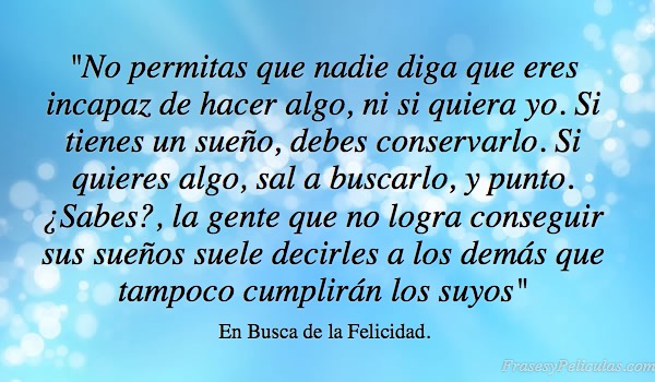 Si quieres puedes crear otra imagen con la frase "No permitas que nadie diga que eres incapaz de hacer algo, ni si quiera yo. Si tienes un sueño, debes conservarlo. Si quieres algo, sal a buscarlo, y punto. ¿Sabes?, la gente que no logra conseguir sus sueños suele decirles a los demás que tampoco cumplirán los suyos".