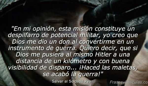 En mi opinión, esta misión constituye un despilfarro de potencial militar, yo creo que Dios me dio un don al convertirme en un instrumento de guerra. Quiero decir, que si Dios me pusiera al mismo Hitler a una distancia de un kilómetro y con buena visibilidad de disparo... ¡Haced las maletas, se acabó la guerra!