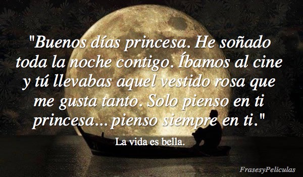 Si quieres puedes crear otra imagen con la frase "Buenos días princesa. He soñado toda la noche contigo. Íbamos al cine y tú llevabas aquel vestido rosa que me gusta tanto. Solo pienso en ti princesa... pienso siempre en ti.".