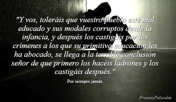 Y vos, toleráis que vuestro pueblo esté mal educado y sus modales corruptos desde la infancia, y después los castigáis por los crímenes a los que su primitiva educación les ha abocado, se llega a la terrible conclusión señor de que primero los hacéis ladrones y los castigáis después.